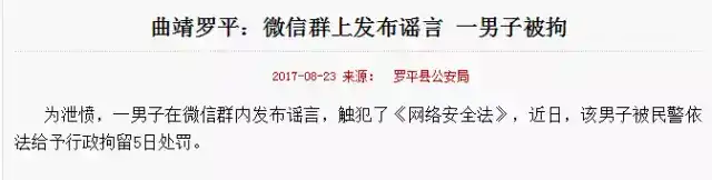 今年8月,云南罗平县警方发出“一男子在微信群内发布谣言,触犯了《网络安全法》,近日,该男子被民警依法给予行政拘留5日处罚。”的消息。