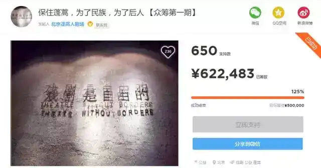 隔年,蓬蒿发起了一次“保住蓬蒿,为了民族,为了后人”的众筹,成功筹得六十多万。为从根本上解决蓬蒿剧场的存在和运营发展,王翔和艺术家蓝天野、公益人徐永光、朱小斌四人发起成立了蓬蒿公益基金会。200万的发起资金,几乎全由王翔借款而来。