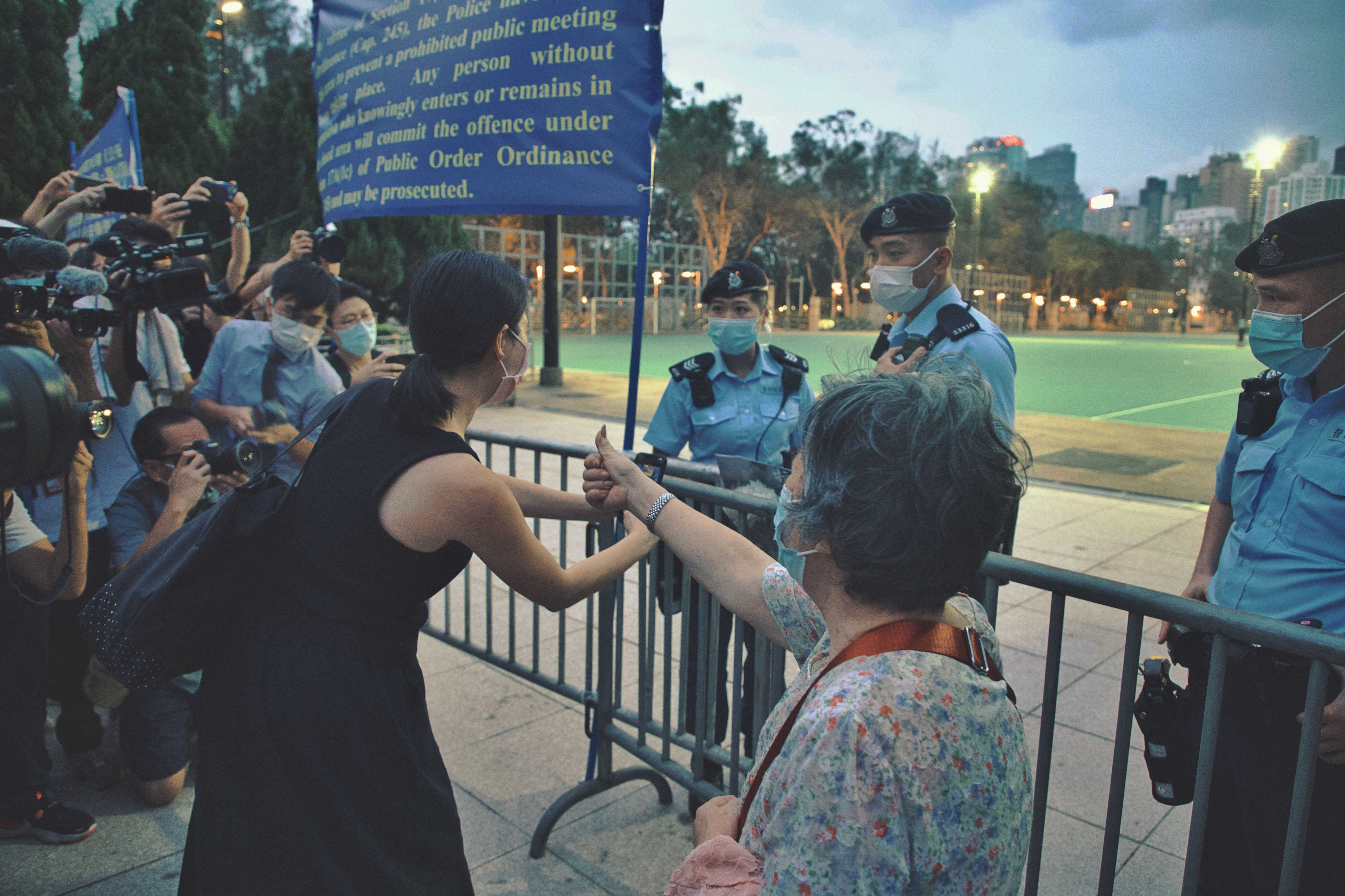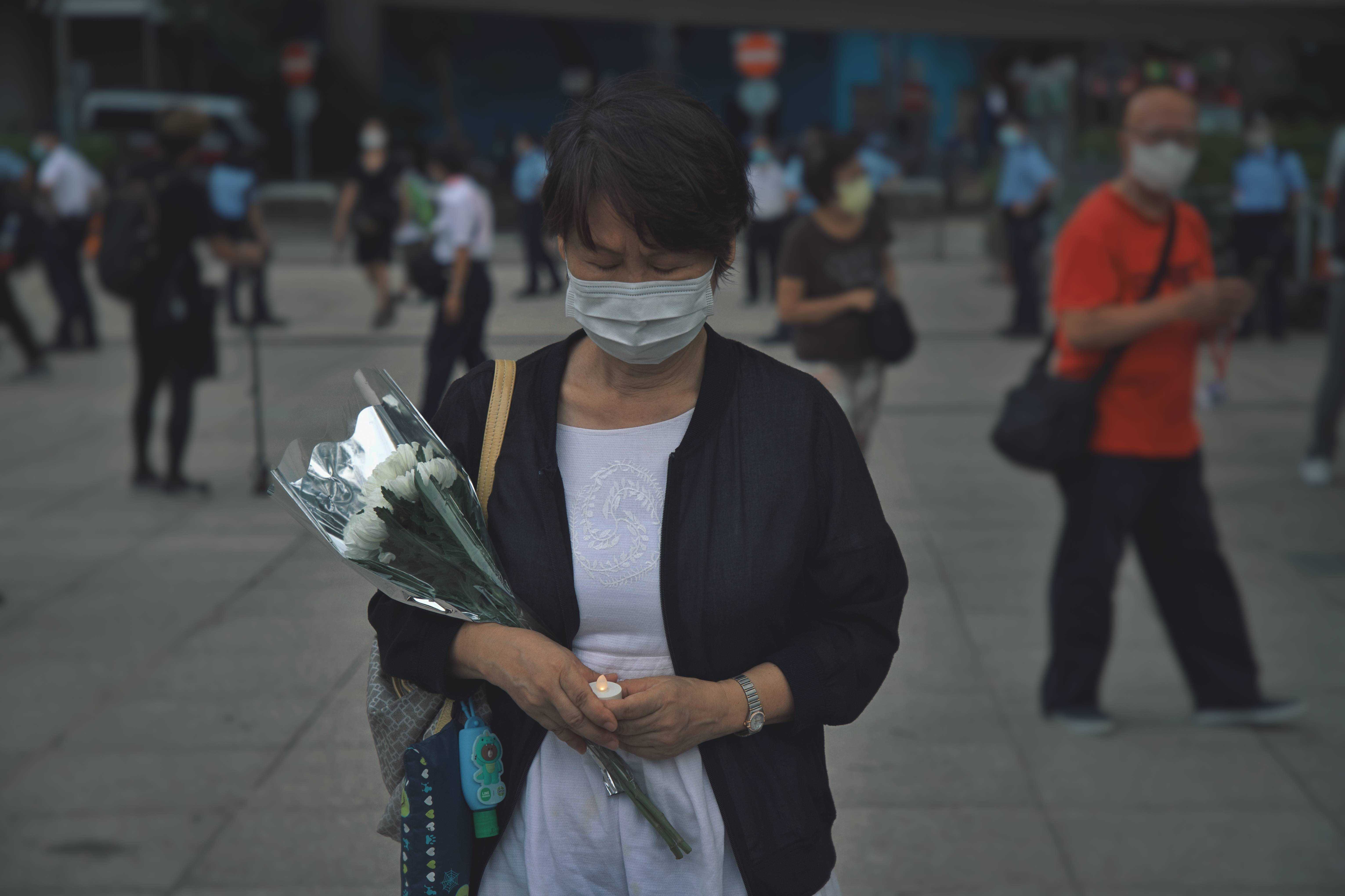 6月4日晚上9点,刘姨姨在维多利亚公园的封锁线外,轻声哼唱:“也许我倒下,将不再起来…你不要悲哀,共和国的旗帜上有我们血染的风采。”