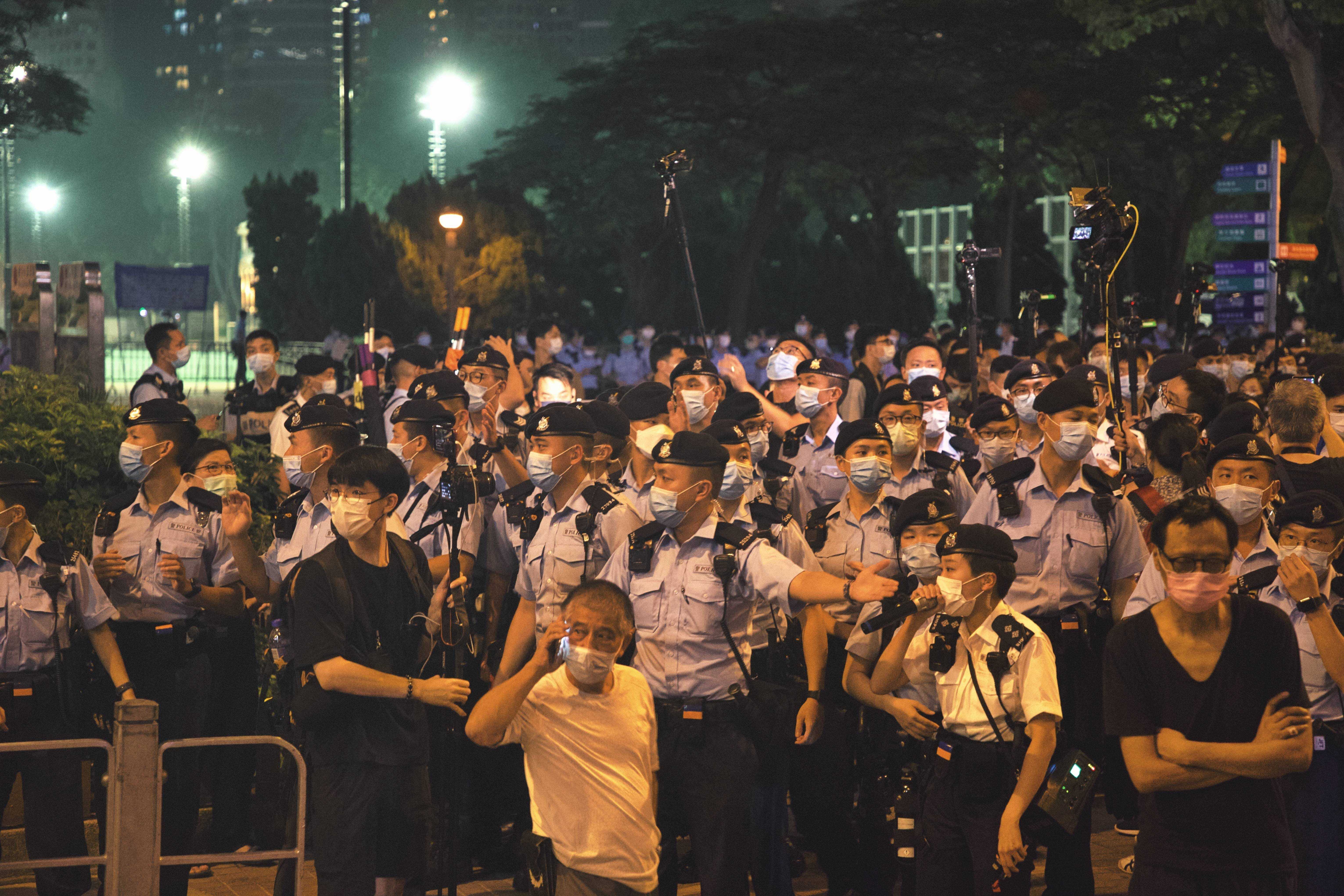 “香港没有沉默。有这样的人心,我觉得香港没有死。”韩东方说。在他身后,银色的手机闪光灯星星点点,环绕着身穿蓝色制服的警察。这里是维园正门临街的十字路口,人群在警察大声的驱赶下慢悠悠地向外撤离。他曾是火车电工,1989年作为北京工人自治联会发言人,在天安门组织工人罢工游行。1993年被驱逐出境,来港创办中国劳工通讯组织,继续为中国工人运动发声。