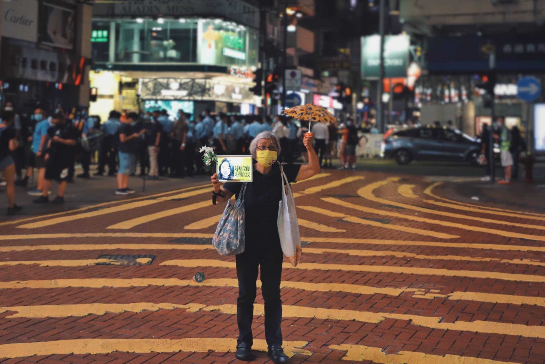 65岁的王凤瑶,因在反修例运动中举着标志性的小黄伞冲在第一线,被人们尊称为“王婆婆”。今年六四,她在维园和时代广场继续撑伞,声援天安门母亲,纪念刘晓波和遇难学生。
