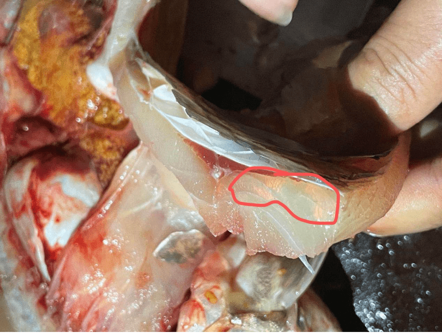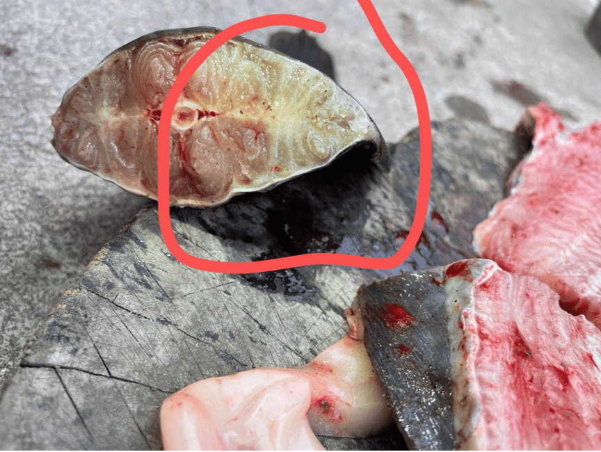 新打捞切开的鱼,鱼肉有些部分呈现金属般的光泽,有些鱼肉则有淡绿色