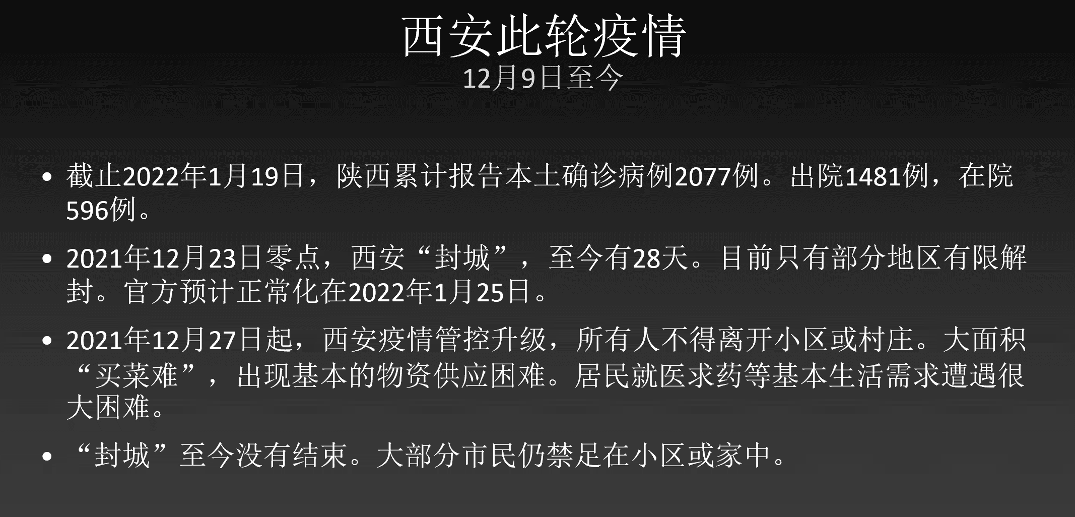 这是对西安这一轮疫情的基本概述——截止2022年的1月19号,陕西累计报告本土确诊病例有2077例。西安成为武汉之后,感染人数最多的一个城市。至今,西安封城28天,宣布了一些区有限的解封。大部分人还是不能离开他们居住的小区或者村落。目前官方预计的正常化是在1月25号左右。
