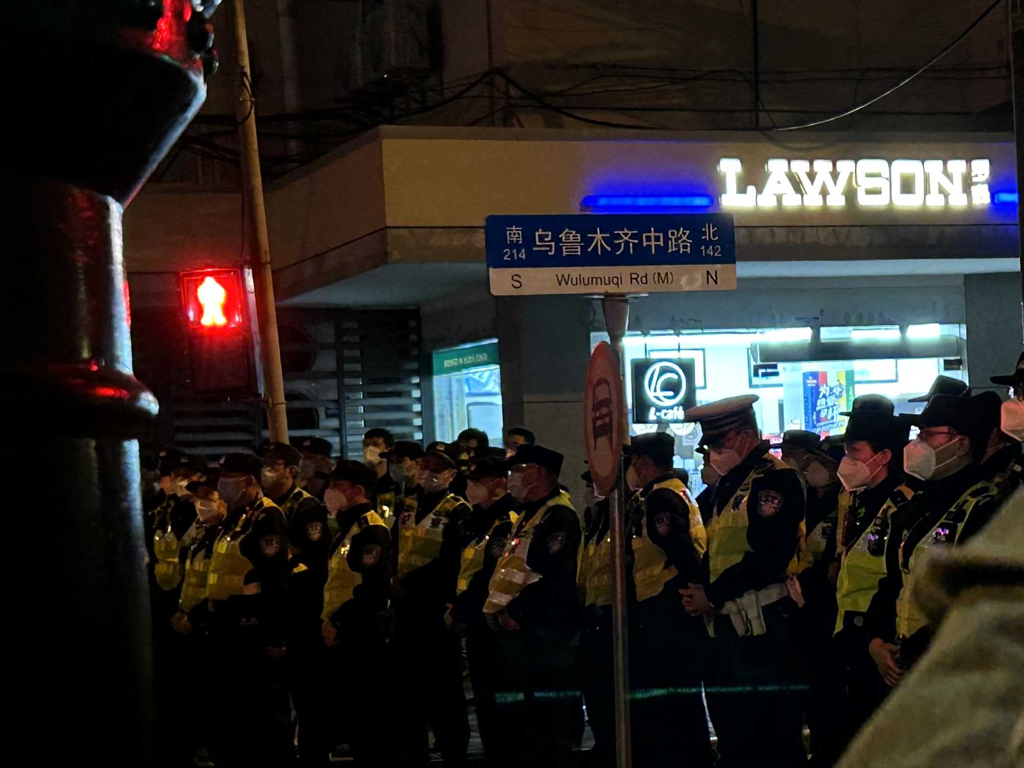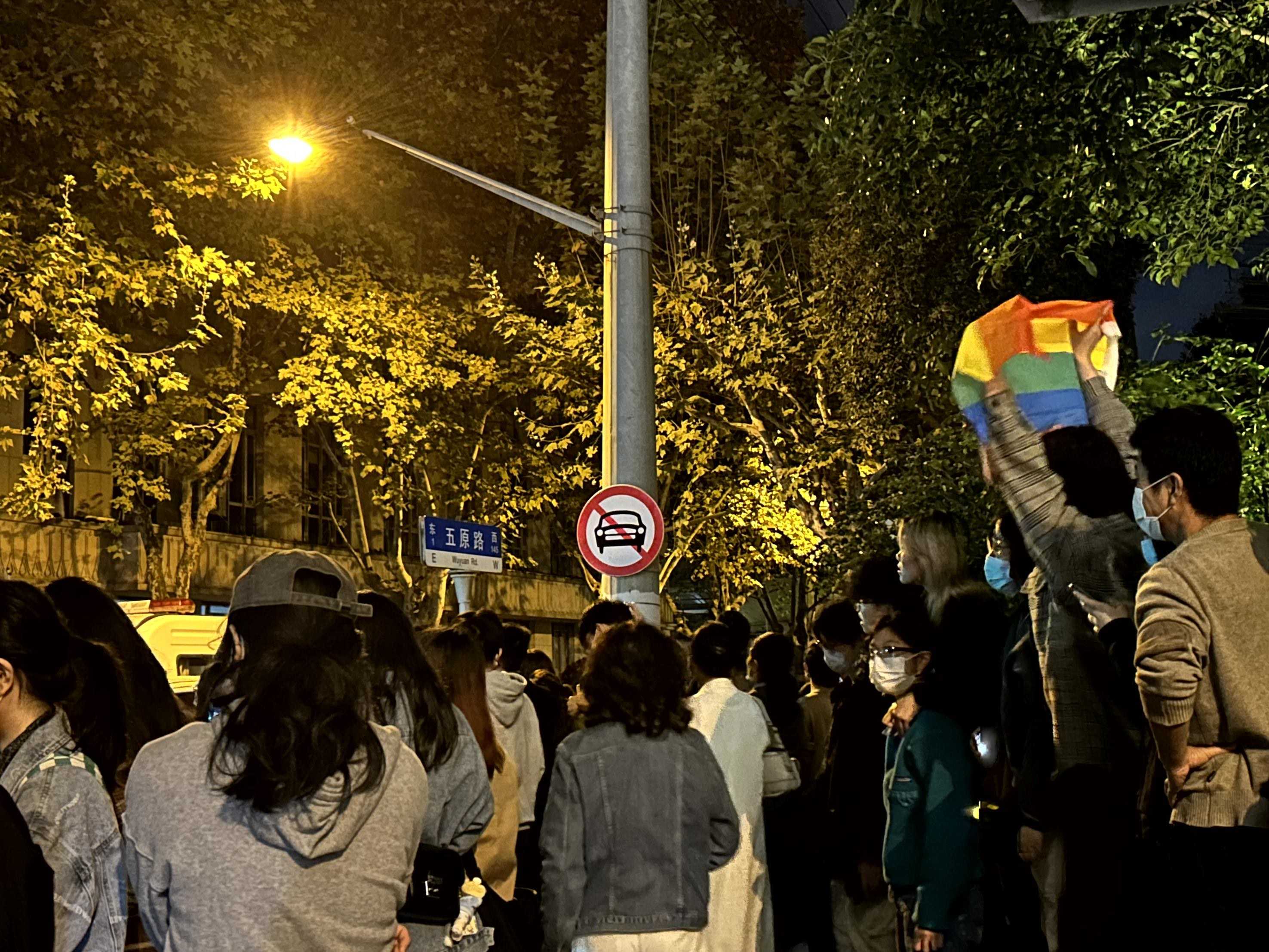 喊得最多的口号是“放人”,因为昨天晚上的悼念现场,警察在乌鲁木齐中路抓捕了不少人。还有就是唱国歌和国际歌,有人喊“打倒法西斯”,有人喊“不要核酸要自由”,有人喊“为人民服务,人民警察为人民”。除了放人,我感觉人群其实并没有一个清晰的诉求,好像每个人对于这次抗议的理解都是不一样的。我不止一次听到,旁边有好奇的路人来问“这是在干什么”,有人回答“悼念乌鲁木齐火灾的受害者”、有人回答“反对动态清零”……