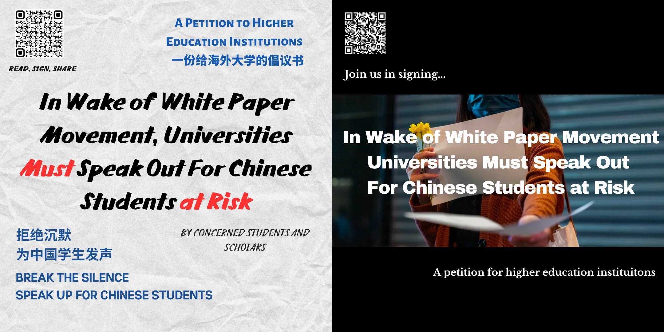 发生于2022年年底的“白纸运动”,有大批抗议者被“秋后算账”,其中有不少被捕者毕业于海外院校。2023年2月上旬,一封名为《白纸运动之后,高等院校须为处境危险的中国学生发声》的英文公开信开始在互联网上流传。公开信呼吁海外的高等学府、教职人员以及其他人,为有风险的中国学生和学者积极发声,并征集联署签名。